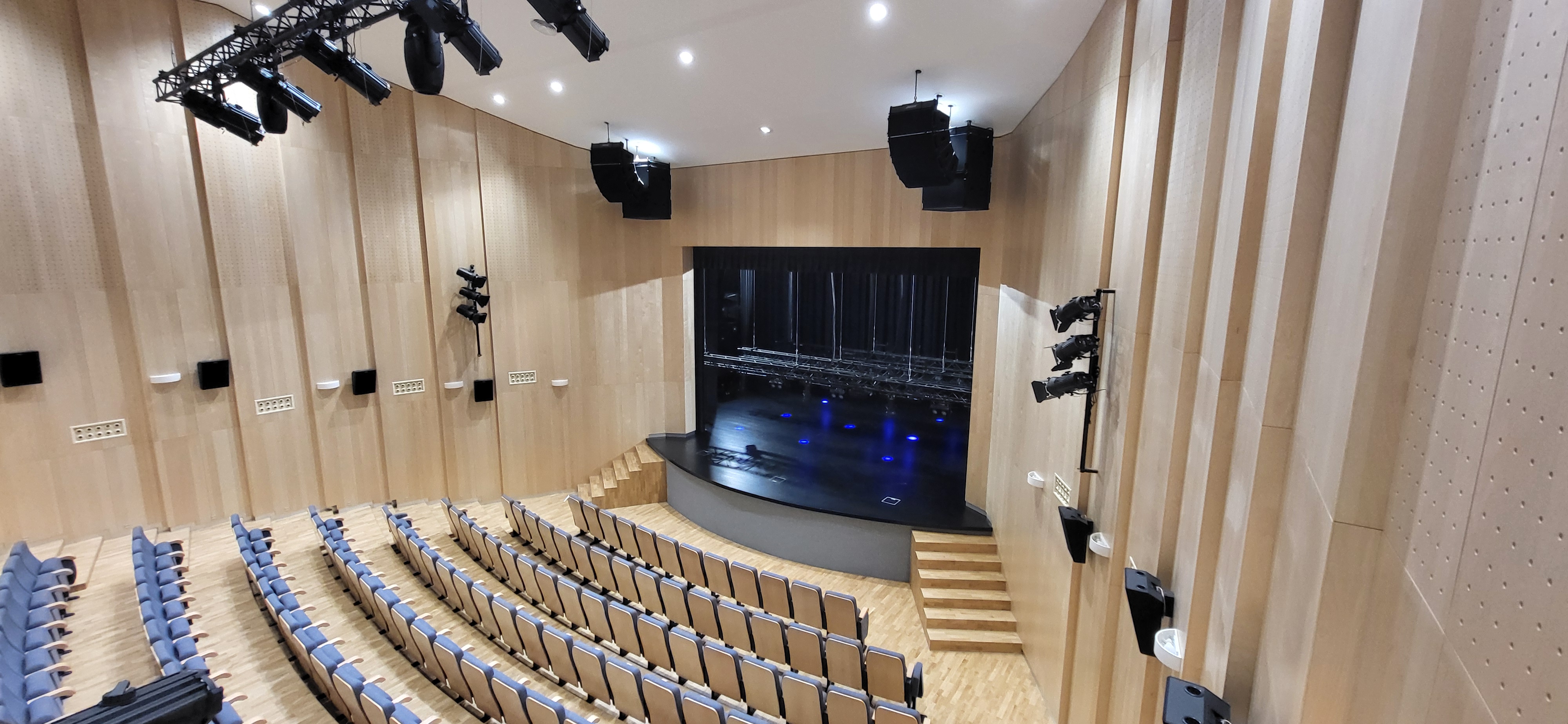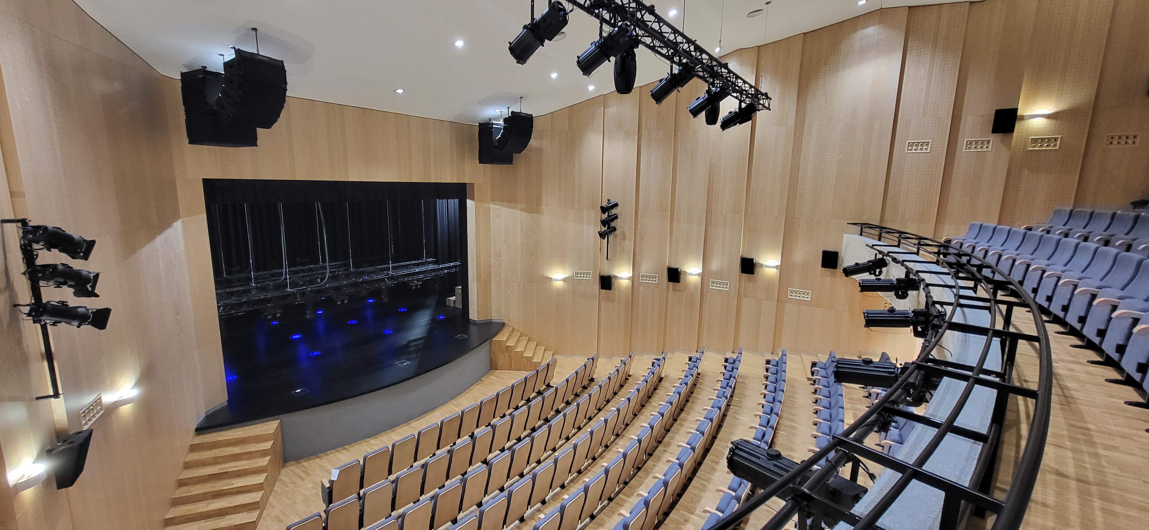 W istniejącym systemie projekcji kinowej DCI odpowiadaliśmy za rozbudowę systemu nagłośnienia w zakresie głośników efektownych (22 sztuki) oraz preferowany ekran projekcyjny o szerokości 7m podwieszony do sztankietu elektrycznego.